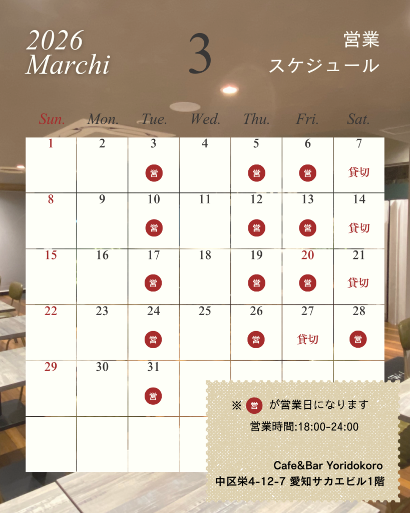 Cafe&Bar Yoridokoro 2026年3月の営業カレンダーです。